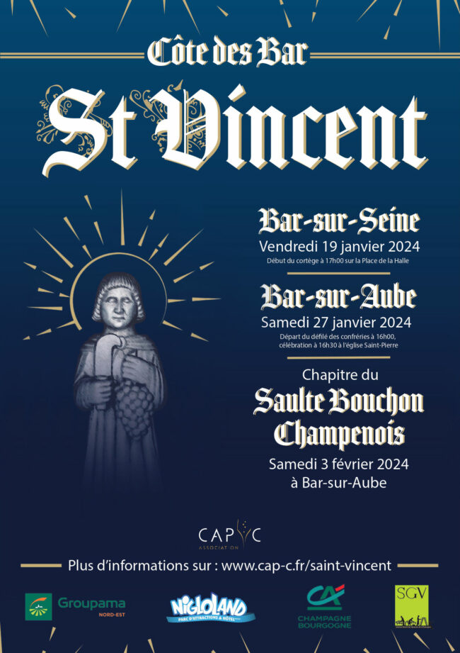 Saint Vincent 2024 – Dans la Côte des Bar Celle du Barséquanais aura lieu le 19 Janvier 2024 et connaîtra des nouveautés, mais Étienne Bertrand (Président de Cap’C) ne les a pas encore dévoilées. Patience donc mais une date à retenir en tout cas. Les Riceys Samedi 27 Janvier 2024 17:00 : Défilé – Célébration 19:00 : Vin…