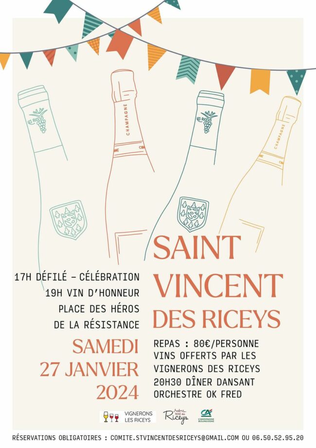 Saint Vincent 2024 17:00 : Défilé – Célébration 19:00 : Vin d’honneur place des Héros de la Résistance 20:30 : Dîner dansant – Orchestre : OK Fred Repas : 80 € / Personne Vins offerts par les Vignerons des Riceys Réservations obligatoires à : comité.stvincentdesriceys@gmail.com ou au +33.6.50..52.95.20
